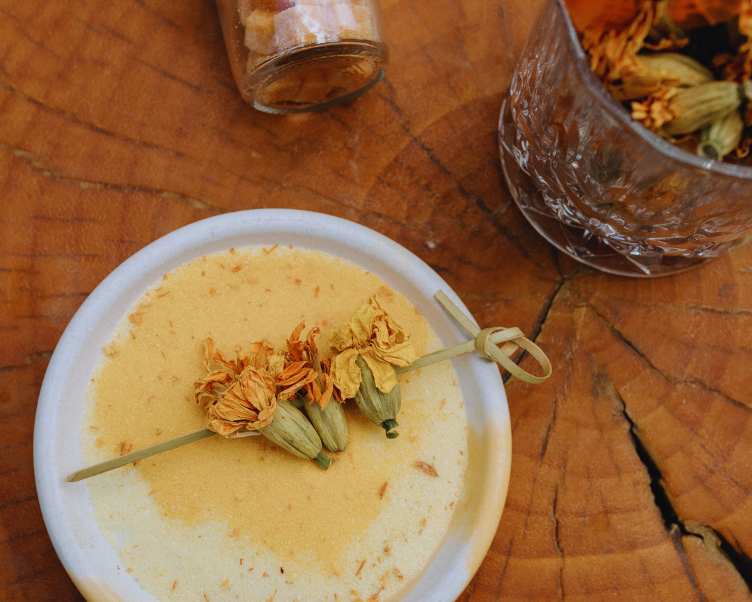 Orange Blossom Finishing Sugar - Ingredients: Cane Sugar, Pure Orange Extract (Alcohol (90%), Natural Oil of Orange, Water), Orange Blossom Water (Propylene Glycol, Alcohol (45%), Orange Oil, Orange Blossom), Cornstarch, Marigold Petals*, 100% Organic Annatto Powder, 100% Organic Safflower Powder. Sweet Rose Water Finishing Sugar - Ingredients: Cane Sugar, Madagascar Bourbon Pure Vanilla Extract (Water, Cane Alcohol (35%), Cane Sugar, Vanilla Bean Extractives), Rose Water (Cane Alcohol (90%), Natural Flavors, Glycerin, Rose Oil), Cornstarch, Organic Rose Petals, Hibiscus Flower Powder. French Lavender Finishing Sugar - Ingredients: Cane Sugar, Pure Lavender Extract (Alcohol (66%), Water, Natural Lavender Oil), Pure Lemon Extract (Alcohol (90%), Natural Oil of Lemon, Water), Cornstarch, Lavender, !00% Pure Black Goji Berry Powder. Organic Butterfly Pea Flower. *Organically Grown Classic Floral Garnishing Salt - Ingredients: Sea Salt Flakes, Dried Herbs, Edible Flower Petals* *Organically grown. This salt does not supply iodine, a necessary nutrient.