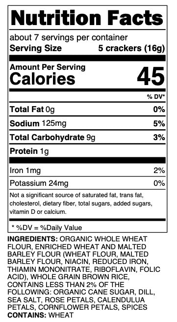 INGREDIENTS: ORGANIC WHOLE WHEAT FLOUR, ENRICHED WHEAT AND MALTED BARLEY FLOUR (WHEAT FLOUR, MALTED BARLEY FLOUR, NIACIN, REDUCED IRON, THIAMIN MONONITRATE, RIBOFLAVIN, FOLIC ACID), WHOLE GRAIN BROWN RICE, CONTAINS LESS THAN 2% OF THE FOLLOWING: ORGANIC CANE SUGAR, DILL, SEA SALT, ROSE PETALS, CALENDULUA PETALS, CORNFLOWER PETALS, SPICES CONTAINS: WHEAT