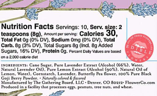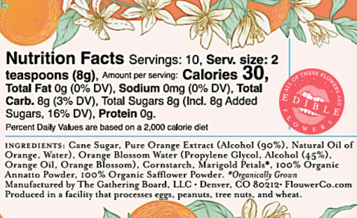 Orange Blossom Cocktail Cubes - Ingredients: Cane Sugar, Pure Orange Extract (Alcohol (90%), Natural Oil of Orange, Water), Orange Blossom Water (Propylene Glycol, Alcohol (45%), Orange Oil, Orange Blossom), Marigold Petals*, 100% Organic Annatto Powder, 100% Organic Safflower Powder. Sweet Rose Water Cocktail Cubes - Ingredients: Cane Sugar, Madagascar Bourbon Pure Vanilla Extract (Water, Cane Alcohol (35%), Cane Sugar, Vanilla Bean Extractives), Rose Water (Cane Alcohol (90%), Natural Flavors, Glycerin, Rose Oil), Organic Rose Petals, Hibiscus Flower Powder. French Lavender Cocktail Cubes - Ingredients: Cane Sugar, Pure Lavender Extract (Alcohol (66%), Water, Natural Lavender Oil), Pure Lemon Extract (Alcohol (90%), Natural Oil of Lemon, Water), Lavender, 100% Pure Black Goji Berry Powder. *Organically Grown Orange Blossom Finishing Sugar - Ingredients: Cane Sugar, Pure Orange Extract (Alcohol (90%), Natural Oil of Orange, Water), Orange Blossom Water (Propylene Glycol, Alcohol (45%), Orange Oil, Orange Blossom), Cornstarch, Marigold Petals*, 100% Organic Annatto Powder, 100% Organic Safflower Powder. Sweet Rose Water Finishing Sugar - Ingredients: Cane Sugar, Madagascar Bourbon Pure Vanilla Extract (Water, Cane Alcohol (35%), Cane Sugar, Vanilla Bean Extractives), Rose Water (Cane Alcohol (90%), Natural Flavors, Glycerin, Rose Oil), Cornstarch, Organic Rose Petals, Hibiscus Flower Powder. French Lavender Finishing Sugar - Ingredients: Cane Sugar, Pure Lavender Extract (Alcohol (66%), Water, Natural Lavender Oil), Pure Lemon Extract (Alcohol (90%), Natural Oil of Lemon, Water), Cornstarch, Lavender, !00% Pure Black Goji Berry Powder. Organic Butterfly Pea Flower. *Organically Grown