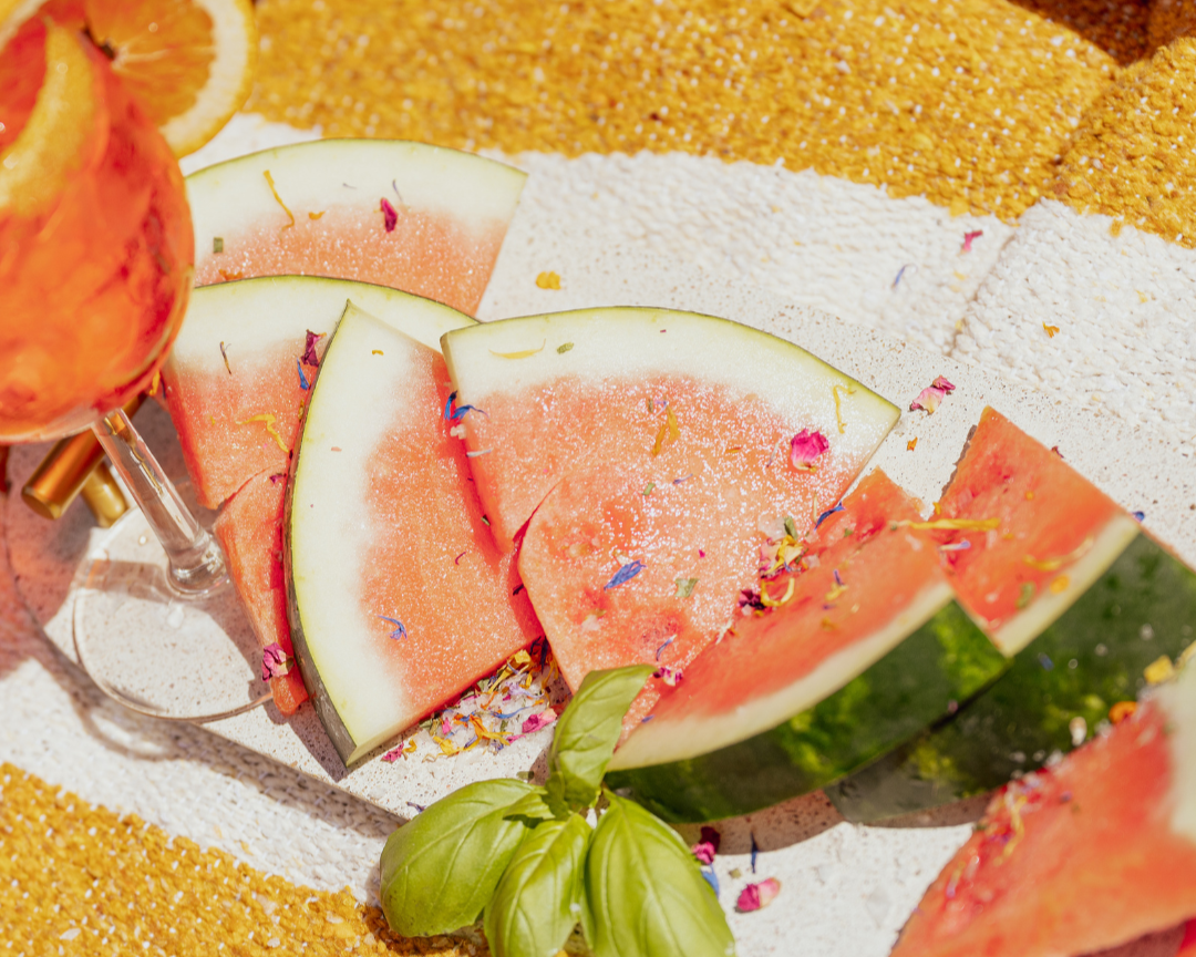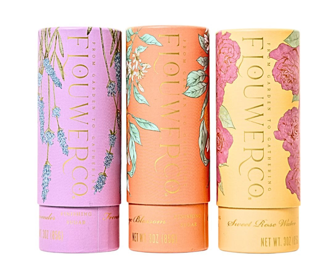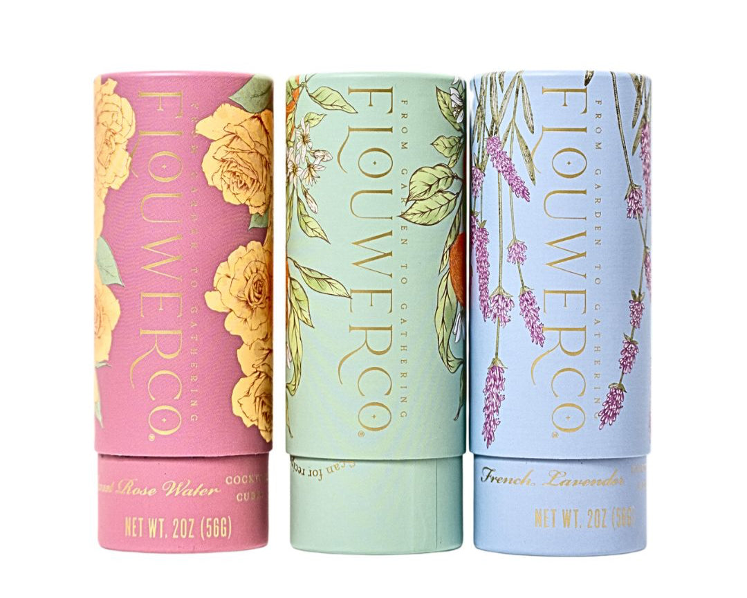 Orange Blossom Cocktail Cubes - Ingredients: Cane Sugar, Pure Orange Extract (Alcohol (90%), Natural Oil of Orange, Water), Orange Blossom Water (Propylene Glycol, Alcohol (45%), Orange Oil, Orange Blossom), Marigold Petals*, 100% Organic Annatto Powder, 100% Organic Safflower Powder. Sweet Rose Water Cocktail Cubes - Ingredients: Cane Sugar, Madagascar Bourbon Pure Vanilla Extract (Water, Cane Alcohol (35%), Cane Sugar, Vanilla Bean Extractives), Rose Water (Cane Alcohol (90%), Natural Flavors, Glycerin, Rose Oil), Organic Rose Petals, Hibiscus Flower Powder. French Lavender Cocktail Cubes - Ingredients: Cane Sugar, Pure Lavender Extract (Alcohol (66%), Water, Natural Lavender Oil), Pure Lemon Extract (Alcohol (90%), Natural Oil of Lemon, Water), Lavender, 100% Pure Black Goji Berry Powder. *Organically Grown Orange Blossom Finishing Sugar - Ingredients: Cane Sugar, Pure Orange Extract (Alcohol (90%), Natural Oil of Orange, Water), Orange Blossom Water (Propylene Glycol, Alcohol (45%), Orange Oil, Orange Blossom), Cornstarch, Marigold Petals*, 100% Organic Annatto Powder, 100% Organic Safflower Powder. Sweet Rose Water Finishing Sugar - Ingredients: Cane Sugar, Madagascar Bourbon Pure Vanilla Extract (Water, Cane Alcohol (35%), Cane Sugar, Vanilla Bean Extractives), Rose Water (Cane Alcohol (90%), Natural Flavors, Glycerin, Rose Oil), Cornstarch, Organic Rose Petals, Hibiscus Flower Powder. French Lavender Finishing Sugar - Ingredients: Cane Sugar, Pure Lavender Extract (Alcohol (66%), Water, Natural Lavender Oil), Pure Lemon Extract (Alcohol (90%), Natural Oil of Lemon, Water), Cornstarch, Lavender, !00% Pure Black Goji Berry Powder. Organic Butterfly Pea Flower. *Organically Grown Classic Floral Garnishing Salt - Ingredients: Sea Salt Flakes, Dried Herbs, Edible Flower Petals* *Organically grown. This salt does not supply iodine, a necessary nutrient.